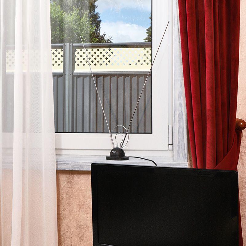 Телескопическая антенна на подставке RX-105 REXANT используется для приема цифрового эфирного вещания на современных телевизорах или комбинированных ресиверах, укомплектованных тюнером стандарта DVB-T2. Предназначена для комнатной установки. Подходит для использования в зоне уверенного приема телесигнала, так как не оснащена встроенным усилителем. Рекомендуемое расстояние до телепередатчика до 10 км. Антенна оснащена регулируемыми телескопическими усами (диполи), которые позволяют настраивать качество приема телевизионного сигнала. Посмотреть зону покрытия цифрового ТВ (DVB-T2) или определить удаленность Базовой Станции (телецентра) от вашего района или населенного пункта можно на официальном сайте ЦТВ: http://цтв.орг/зона-покрытия Тип подключения – ТВ штекер. Масса: 0,2 кг.