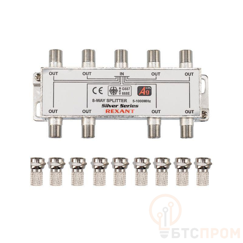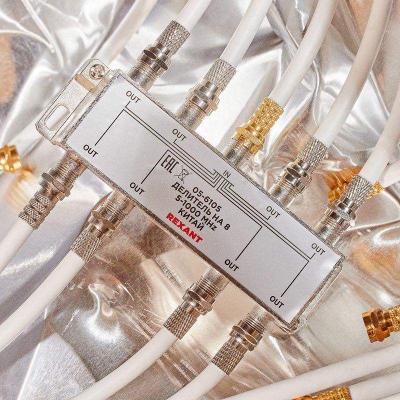 Телевизионный делитель или сплиттер предназначен для телевизионных систем и используется в домах и квартирах, где требуется подключить несколько телевизоров к одной антенне. Сплиттер распределяет поступающий на вход сигнал поровну на его выходы, что обеспечивает одинаково четкое изображение на всех подключенных устройствах. Устройство оснащено восемью выходами для сигнала и подключается с помощью стандартных F-разъемов. В комплекте поставляется 9 F-разъемов. Пайка внутри делителя осуществляется с использованием серебросодержащего припоя, что позволяет получить сигнал высокого качества и увеличить надежность. Делитель имеет надежный металлический корпус. Данный делитель подходит для сигналов с частотой 5-1000 МГц, что соответствует стандартному эфирному телевидению.