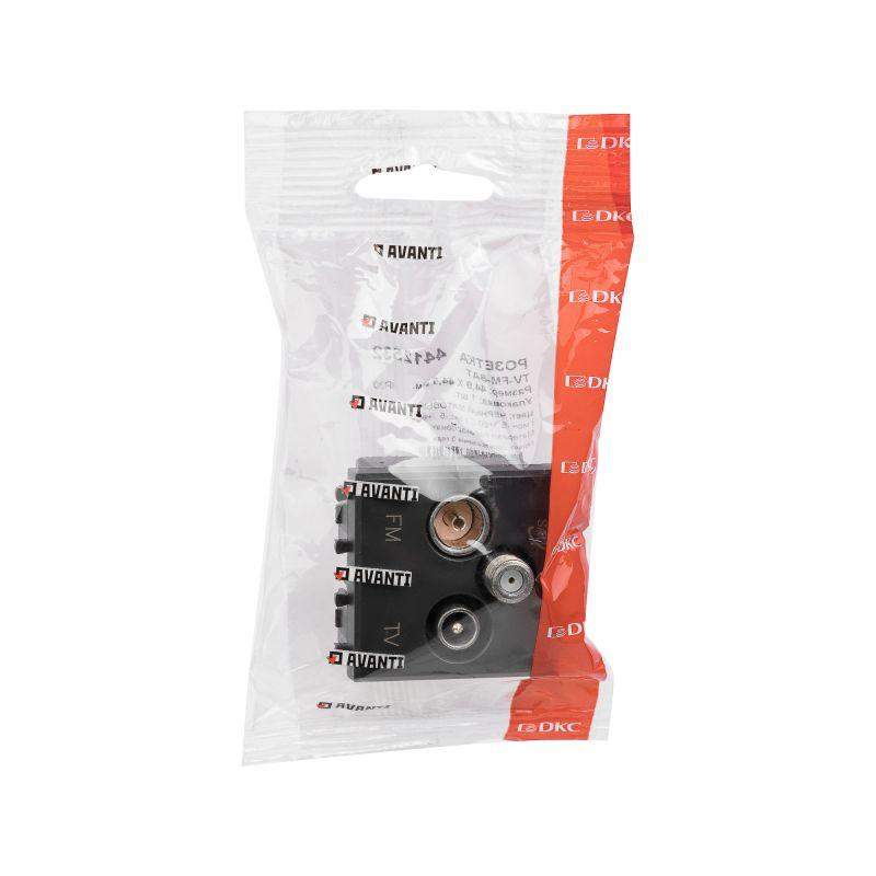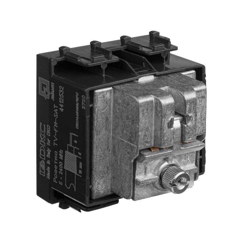 Розетка TV-FM-SAT модульная. Назначение: для монтажа в систему пластиковых кабельных коробов "In-liner Front" и систему организации рабочих мест "Sotto" (в т.ч. кабель-каналы и короба "Aero") при помощи рамок-суппортов и каркасов "Avanti" (код 4400912 и т.д.). Используется для подключения теле- и радиокабеля. Характеристики: винтовые зажимы; диапазон рабочих частот 4–2400 МГц; затухание