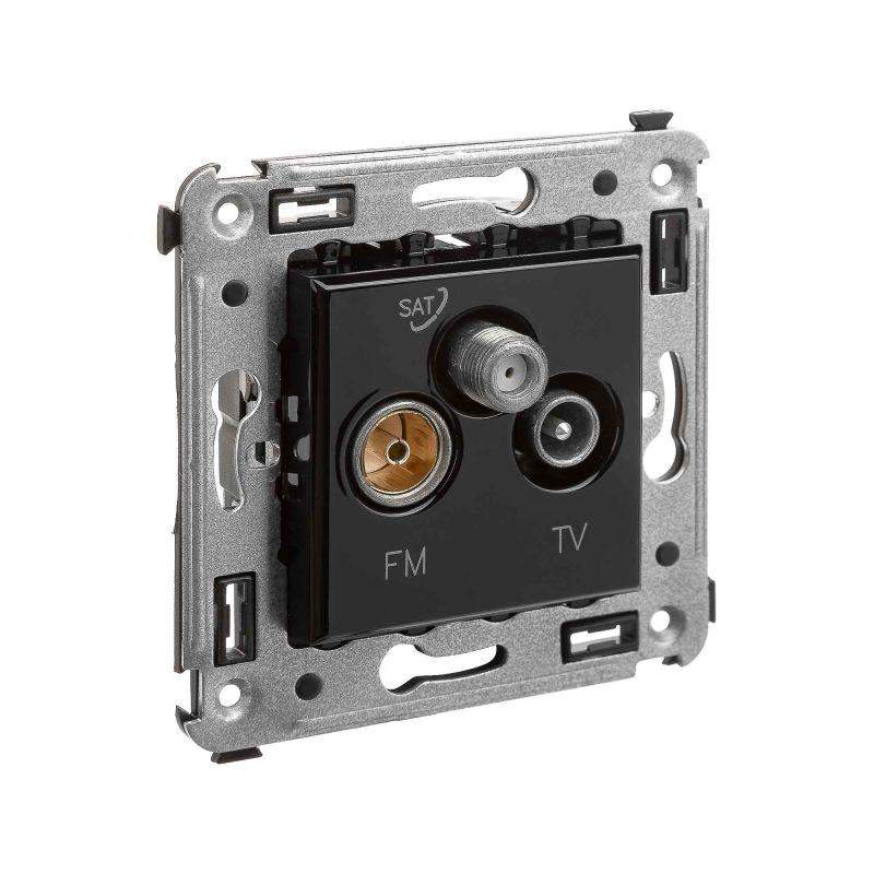 Розетка TV-FM-SAT. Назначение: для монтажа в подрозеточные коробки глубиной не менее 45 мм (код 59301). Предназначена для подключения телевизионного, спутникового телевизионного и радио- кабеля к телевизору. Характеристики: винтовые зажимы; диапазон рабочих частот 4–2400 МГц; затухание