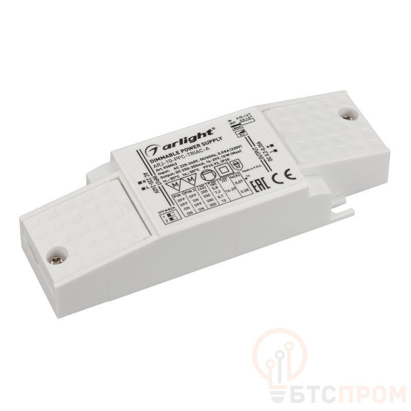 Диммируемый источник тока по стандарту TRIAC с гальванической развязкой для светильников и мощных светодиодов. Входное напряжение 220-240 VAC. Выходные параметры: 16-29 В, 200-350 mА, 10 Вт. Выбор значения тока осуществляется DIP-переключателем. Встроенный PFC >0,92. Негерметичный пластиковый корпус IP 20. Габаритные размеры длина 122 мм, ширина 41 мм, высота 23 мм. Гарантийный срок 5 лет.