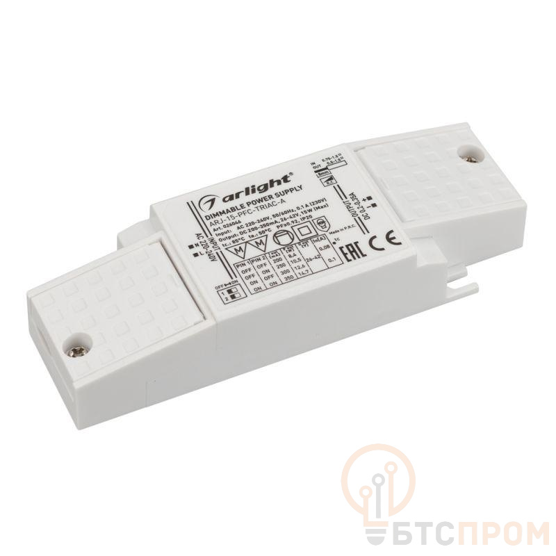 Диммируемый источник тока по стандарту TRIAC с гальванической развязкой для светильников и мощных светодиодов. Входное напряжение 220-240 VAC. Выходные параметры: 26-42 В, 200-350 mА, 15 Вт. Выбор значения тока осуществляется DIP-переключателем. Встроенный PFC >0,92. Негерметичный пластиковый корпус IP 20. Габаритные размеры длина 122 мм, ширина 41 мм, высота 23 мм. Гарантийный срок 5 лет.