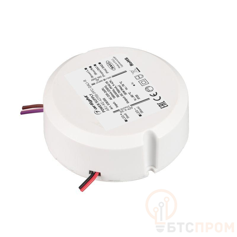 Диммируемый источник тока по протоколу DALI и функцией Push Dim с гальванической развязкой для светильников и мощных светодиодов. Входное напряжение 220-240 VAC. Выходные параметры: 9-42В (700мА), максимальная мощность 30 Вт. Встроенный PFC >0,95. Негерметичный пластиковый корпус IP 20. Габаритные размеры диаметр в окружности O80 мм, высота 30 мм. Гарантийный срок 3 года.