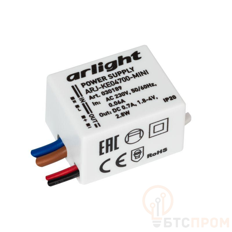 Источник тока с гальванической развязкой для светильников и мощных светодиодов. Входное напряжение 220-240 VAC. Выходные параметры: 1,8-4 В, 700 mА, 2,8 Вт. Встроенный PFC >0.4. Негерметичный пластиковый корпус IP 20. Габаритные размеры длина 34 мм, ширина 22.8 мм, высота 17 мм. Гарантийный срок 5 лет.