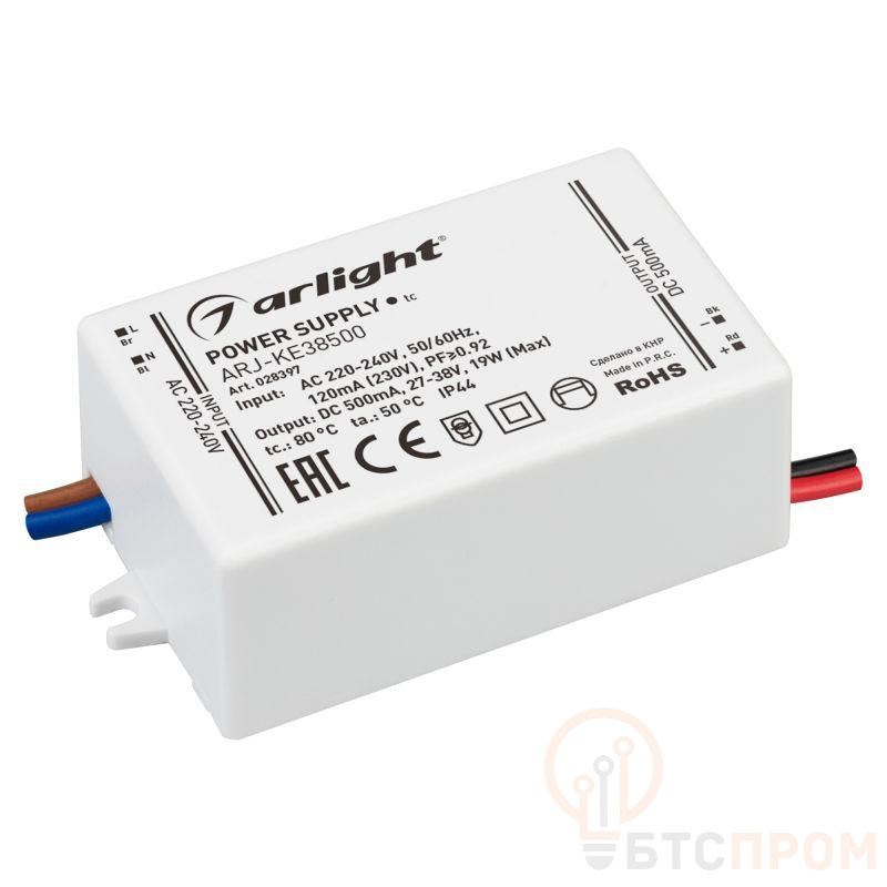 Источник тока с гальванической развязкой для светильников и мощных светодиодов. Входное напряжение 220-240 VAC. Выходные параметры: 27-38 В, 500 mА, 19 Вт. Встроенный PFC >0.92. Негерметичный пластиковый корпус IP 44. Габаритные размеры длина 68 мм, ширина 36 мм, высота 23 мм. Гарантийный срок 5 лет.