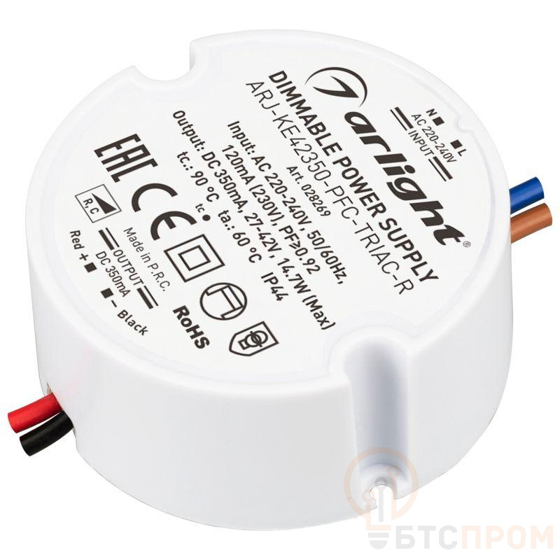 Диммируемый источник тока по стандарту TRIAC с гальванической развязкой для светильников и мощных светодиодов. Входное напряжение 220-240 VAC. Выходные параметры: 27-42 В, 350 mА, 15 Вт. Встроенный PFC >0,92. Негерметичный пластиковый корпус IP 44. Габаритные размеры диаметр в окружности O51 мм, высота 22 мм. Гарантийный срок 5 лет.