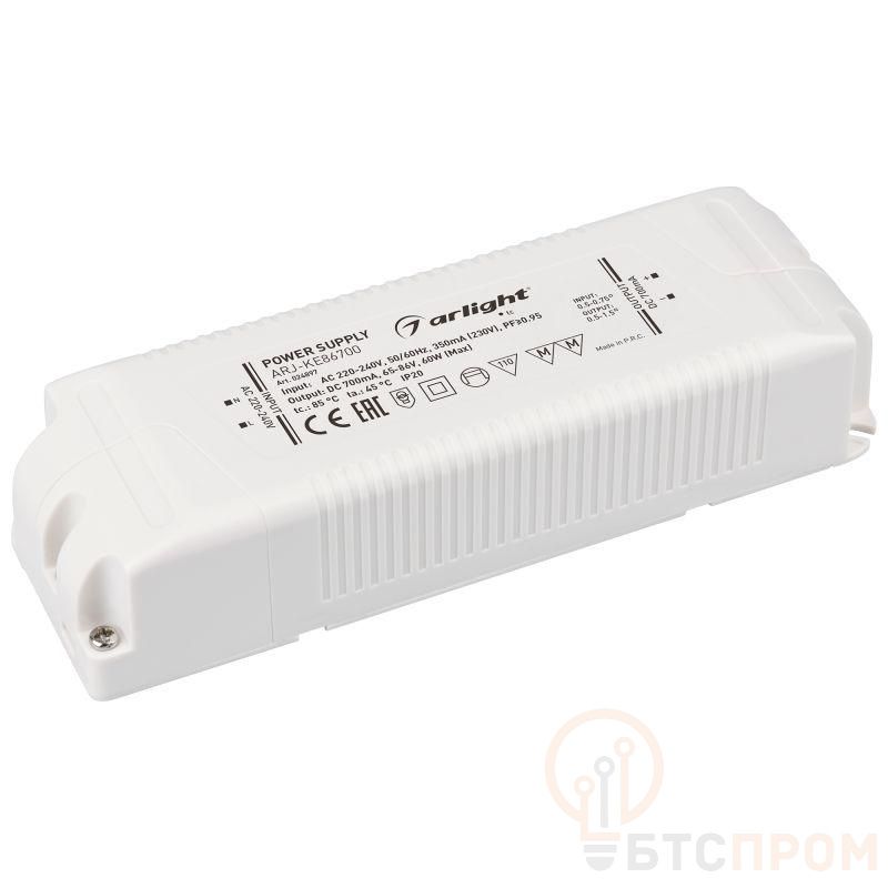 Источник тока с гальванической развязкой для светильников и мощных светодиодов. Входное напряжение 220-240 VAC. Выходные параметры: 65-85 В, 700 mА, 60 Вт. Встроенный PFC >0,95. Негерметичный пластиковый корпус IP 20. Габаритные размеры длина 155 мм, ширина 49 мм, высота 33 мм. Гарантийный срок 5 лет.