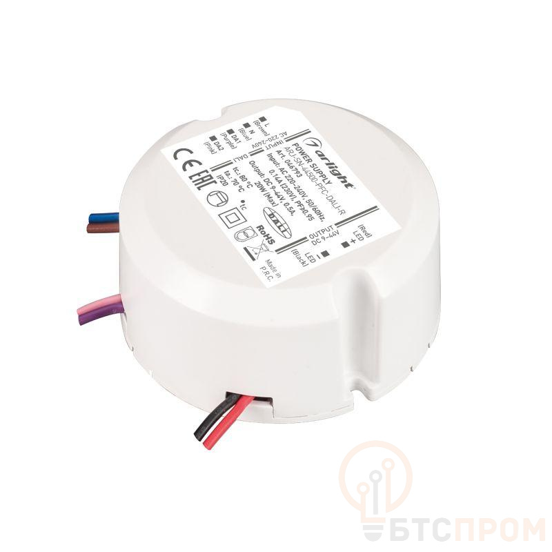 Диммируемый источник тока по протоколу DALI и функцией Push Dim с гальванической развязкой для светильников и мощных светодиодов. Входное напряжение 220-240 VAC. Выходные параметры: 9-40В (500мА), максимальная мощность 20 Вт. Встроенный PFC >0,95. Негерметичный пластиковый корпус IP 20. Габаритные размеры диаметр в окружности O65 мм, высота 28 мм. Гарантийный срок 3 года.