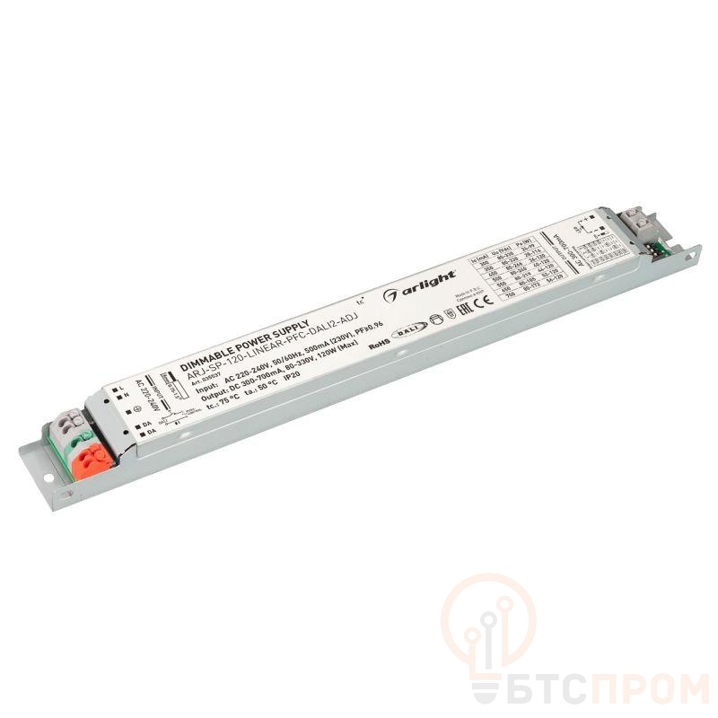 Диммируемый источник тока без гальванической развязки с регулировкой для светильников и мощных светодиодов. Входное напряжение 220-240 VAC. Предназначены для питания групп светильников и светодиодов от одного источника тока. Выходные параметры: 80-330В (300мА), 80-330В (350мА), 80-266В (450мА), 80-240В (500мА), 80-219В (550мА), 80-185В (650мА), 80-172В (700мА),максимальная мощность 120 Вт. Встроенный PFC >0,96. Негерметичный металлический корпус IP 20. Габаритные размеры длина 284 мм, ширина 30 мм, высота 20 мм. Гарантийный срок 5 лет.