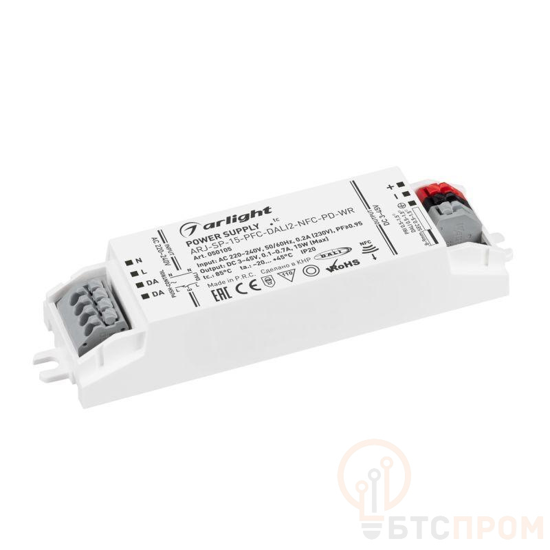 Диммируемый мультитоковый блок питания с управлением DALI 2.0 и функцией Push Dim с гальванической развязкой. Входное напряжение 220-240 VAC. Выходные параметры: 3-45В (100-300мA), 3-42В (350мА), 3-37В (400мА), 3-33В (450мА), 3-30В (500мА), 3-27В (550мА), 3-25В (600мА), 3-23В (650мА), 3-21В (700мА); 15Вт, PF >0,95. Негерметичный пластиковый корпус IP 20. Выбор значения выходного тока осуществляется с помощью NFC технологии. Настройки DALI устанавливаются стандартным способом. Габаритные размеры длина 65 мм, ширина 40 мм, высота 23 мм. Гарантийный срок 5 лет. Для корректной работы необходим RFID считыватель NFC. Подробная инструкция и приложение доступны по адресу https://arlight.ru/support/apps/