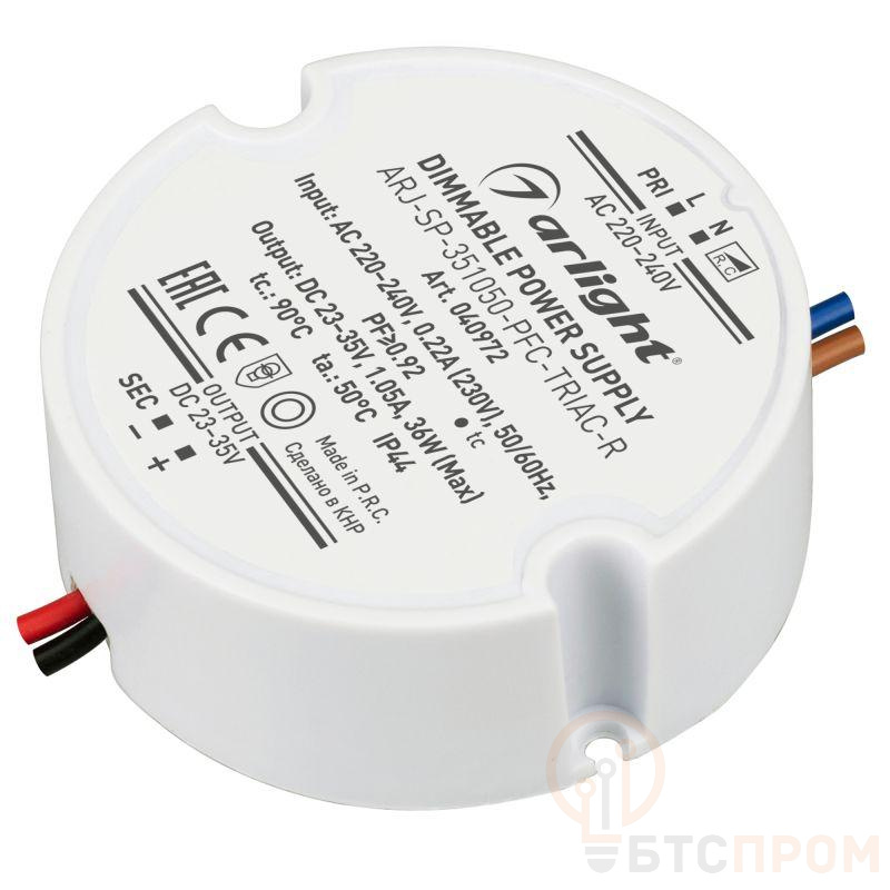 Диммируемый источник тока по стандарту TRIAC с гальванической развязкой для светильников и мощных светодиодов. Входное напряжение 220-240 VAC. Выходные параметры: 23-35 В, 1050 mА, 36 Вт. Встроенный PFC >0,92. Негерметичный пластиковый корпус IP 44. Габаритные размеры диаметр в окружности O70 мм, высота 25 мм. Гарантийный срок 5 лет.