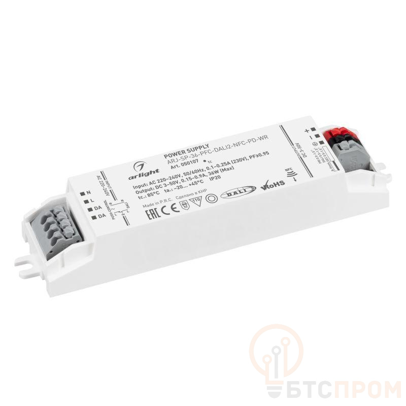 Диммируемый мультитоковый блок питания с управлением DALI 2.0 и функцией Push Dim с гальванической развязкой. Входное напряжение 220-240 VAC. Выходные параметры: 3-50В (150-700мA), 3-42В (750-850мА), 3-40В (900мА); 36Вт, PF >0,95. Негерметичный пластиковый корпус IP 20. Выбор значения выходного тока осуществляется с помощью NFC технологии. Настройки DALI устанавливаются стандартным способом. Габаритные размеры длина 128 мм, ширина 30 мм, высота 21 мм. Гарантийный срок 5 лет. Для корректной работы необходим RFID считыватель NFC. Подробная инструкция и приложение доступны по адресу https://arlight.ru/support/apps/