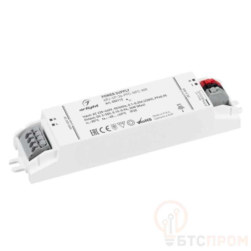 Мультитоковый блок питания с гальванической развязкой. Входное напряжение 220-240 VAC. Выходные параметры: 3-50В (150-700мA), 3-42В (750-850мА), 3-40В (900мА); 36Вт, PF >0,95. Негерметичный пластиковый корпус IP 20. Выбор значения выходного тока осуществляется с помощью NFC технологии. Габаритные размеры длина 128 мм, ширина 30 мм, высота 21 мм. Гарантийный срок 5 лет. Для корректной работы необходим RFID считыватель NFC. Подробная инструкция и приложение доступны по адресу https://arlight.ru/support/apps/