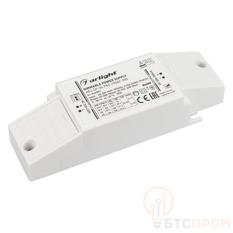 Диммируемый источник тока по стандарту TRIAC с гальванической развязкой для светильников и мощных светодиодов. Входное напряжение 220-240 VAC. Выходные параметры: 30-52 В, 500-700 mА, 36 Вт. Выбор значения тока осуществляется DIP-переключателем. Встроенный PFC >0,92. Негерметичный пластиковый корпус IP 20. Габаритные размеры 138х44х30 мм. (98х44х30 мм. без крышек). Гарантийный срок 5 лет.