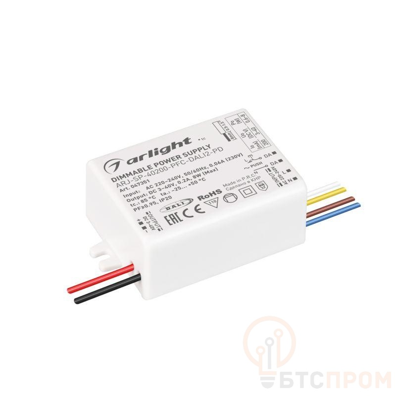 Диммируемый токовый блок питания с управлением DALI 2.0 и функцией Push Dim с гальванической развязкой. Входное напряжение 220-240VAC. Выходные параметры: 3-40В (200мA), максимальная мощность 8 Вт, PFC >0,95. Габаритные размеры: длина 65 мм.(53 мм. без креплений), ширина 40 мм., высота 23 мм. Гарантийный срок 5 лет.