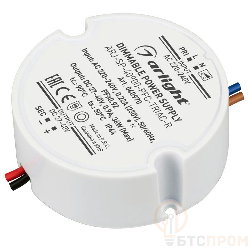 Диммируемый источник тока по стандарту TRIAC с гальванической развязкой для светильников и мощных светодиодов. Входное напряжение 220-240 VAC. Выходные параметры: 27-40 В, 900 mА, 36 Вт. Встроенный PFC >0,92. Негерметичный пластиковый корпус IP 44. Габаритные размеры диаметр в окружности O70 мм, высота 25 мм. Гарантийный срок 5 лет.