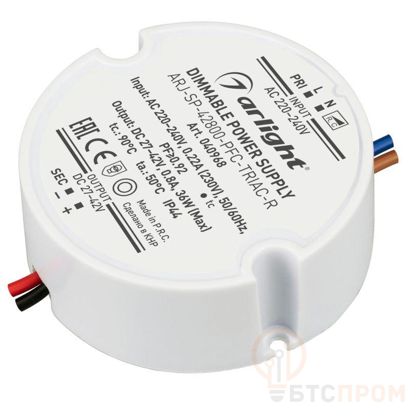 Диммируемый источник тока по стандарту TRIAC с гальванической развязкой для светильников и мощных светодиодов. Входное напряжение 220-240 VAC. Выходные параметры: 27-42 В, 800 mА, 36 Вт. Встроенный PFC >0,92. Негерметичный пластиковый корпус IP 44. Габаритные размеры диаметр в окружности O70 мм, высота 25 мм. Гарантийный срок 5 лет.