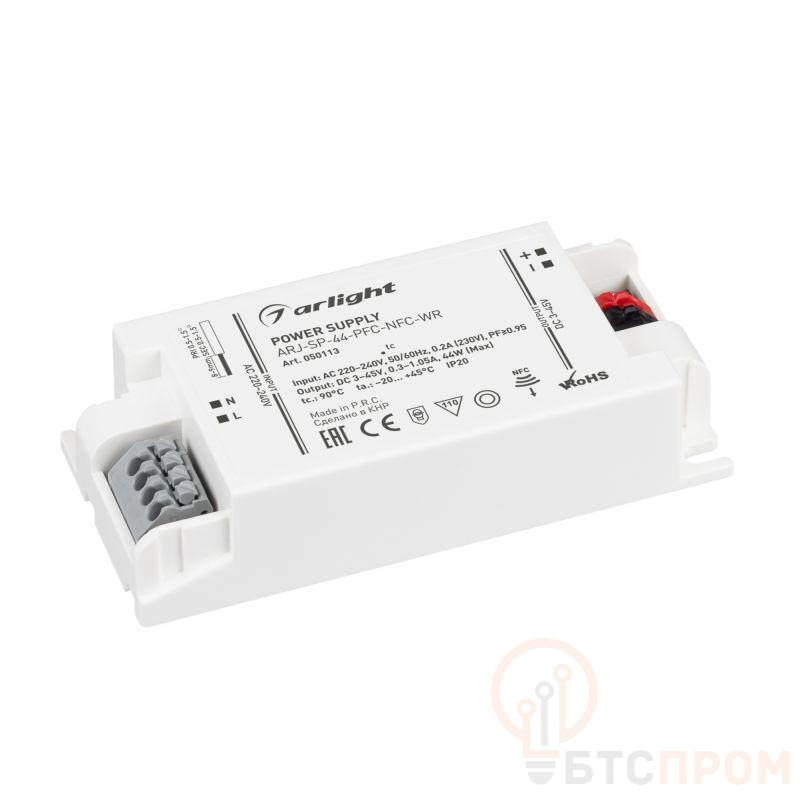 Мультитоковый блок питания с гальванической развязкой. Входное напряжение 220-240 VAC. Выходные параметры: 3-45В (300-900мA), 3-42В (950-1050мА); 44Вт, PF >0,95. Негерметичный пластиковый корпус IP 20. Выбор значения выходного тока осуществляется с помощью NFC технологии. Габаритные размеры длина 97 мм, ширина 43 мм, высота 23 мм. Гарантийный срок 5 лет. Для корректной работы необходим RFID считыватель NFC. Подробная инструкция и приложение доступны по адресу https://arlight.ru/support/apps/