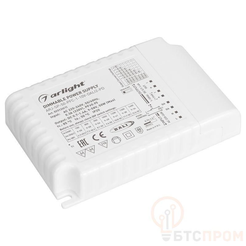 Диммируемый источник тока по протоколу DALI 2.0 (диапазон 2-100%) и 1-10V (диапазон 2%-100%) с гальванической развязкой для светильников и мощных светодиодов. Входное напряжение 220-240 VAC. Выходные параметры: 9-58В (700/800мА), 9-56В (900мА), 9-48В (1050мА), 9-41В (1200мА), 9-38В (1300мА), 9-36В (1400мА), максимальная мощность 50 Вт. Встроенный PFC >0.9. Негерметичный пластиковый корпус IP 20. Габаритные размеры длина 123 мм, ширина 79 мм, высота 24 мм. Гарантийный срок 5 лет.