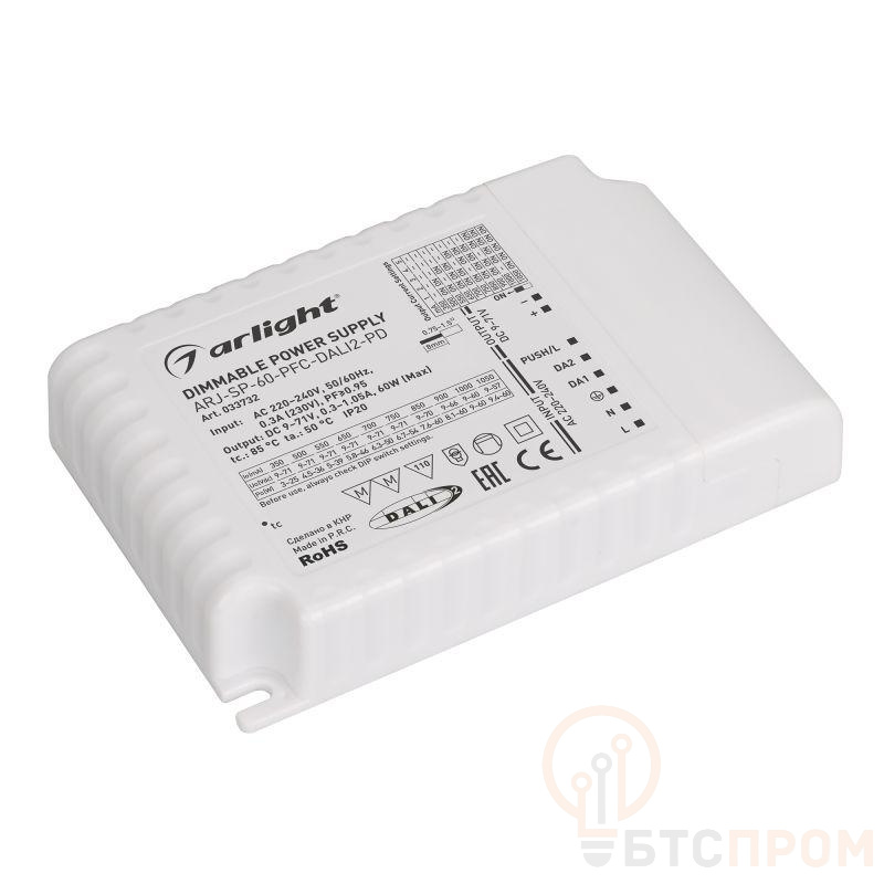 Диммируемый мультитоковый блок питания с управлением DALI 2.0 (диапазон 0.1-100%) с гальванической развязкой. Функция PUSH DIM. Входное напряжение 220-240 VAC. Выходные параметры: 9-71В (350/500/550/650/700/750мA); 9-70В (850мA); 9-66В (900мA); 9-60В (1000мA); 9-57В (1050мA), максимальная мощность 60Вт. Встроенный PFC >0.9. Негерметичный пластиковый корпус IP 20. Габаритные размеры длина 123 мм, ширина 79 мм, высота 24 мм. Гарантийный срок 5 лет.