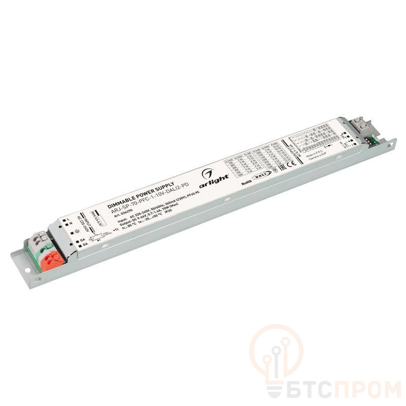 Диммируемый источник тока по протоколу DALI 2.0 (диапазон 0-100%) и 1-10V (диапазон 2%-100%) с гальванической развязкой для светильников и мощных светодиодов. Входное напряжение 220-240 VAC. Выходные параметры: 9-66В (700/800/850/900/950/1000/1050мА), 9-63В (1100мА), 9-61В (1150мА), 9-58В (1200мА), 9-56В (1250мА), 9-54В (1300мА), 9-50В (1400мА), максимальная мощность 70 Вт. Встроенный PFC >0.95. Негерметичный металлический корпус IP 20. Габаритные размеры длина 284 мм, ширина 30 мм, высота 21 мм. Гарантийный срок 5 лет.