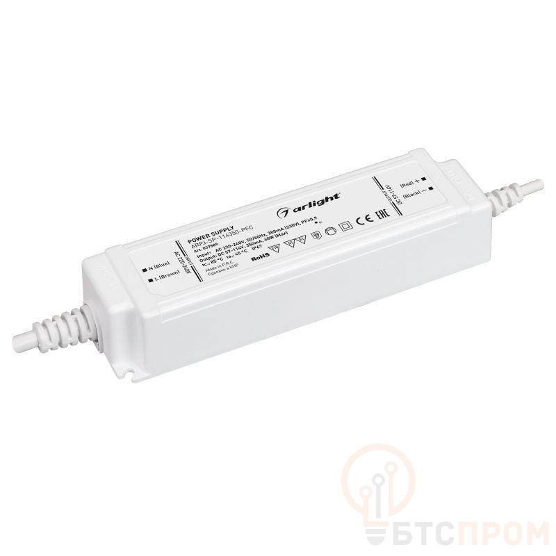 Источник тока с гальванической развязкой для светильников и мощных светодиодов. Входное напряжение 220-240 VAC. Выходные параметры: 57-114 В, 350 mА, 40 Вт. Встроенный PFC >0.9. Герметичный пластиковый корпус IP 67. Габаритные размеры длина 150 мм, ширина 40 мм, высота 30 мм. Гарантийный срок 5 лет.