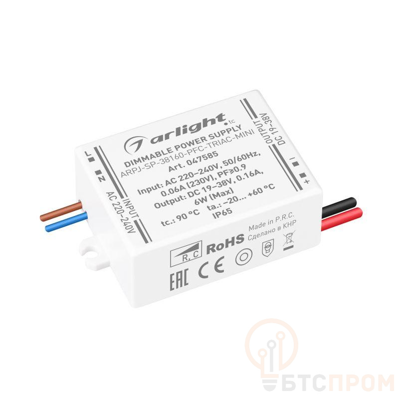 Диммируемый источник тока по стандарту TRIAC с гальванической развязкой для светильников и мощных светодиодов. Входное напряжение 220-240 VAC. Выходные параметры: 19-38 В, 160 mА, 6 Вт. Встроенный PFC >0,9. Герметичный пластиковый корпус IP 65. Габаритные размеры длина 48 мм. (без креплений 38мм) , ширина 30 мм, высота 20 мм. Гарантийный срок 5 лет.