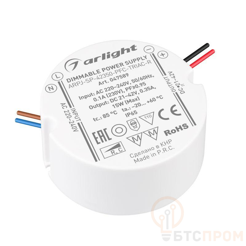Диммируемый источник тока по стандарту TRIAC с гальванической развязкой для светильников и мощных светодиодов. Входное напряжение 220-240 VAC. Выходные параметры: 21-42 В, 350 mА, 15 Вт. Встроенный PFC >0,95. Герметичный пластиковый корпус IP 65. Габаритные размеры диаметр в окружности O56, высота 25 мм. Гарантийный срок 5 лет.