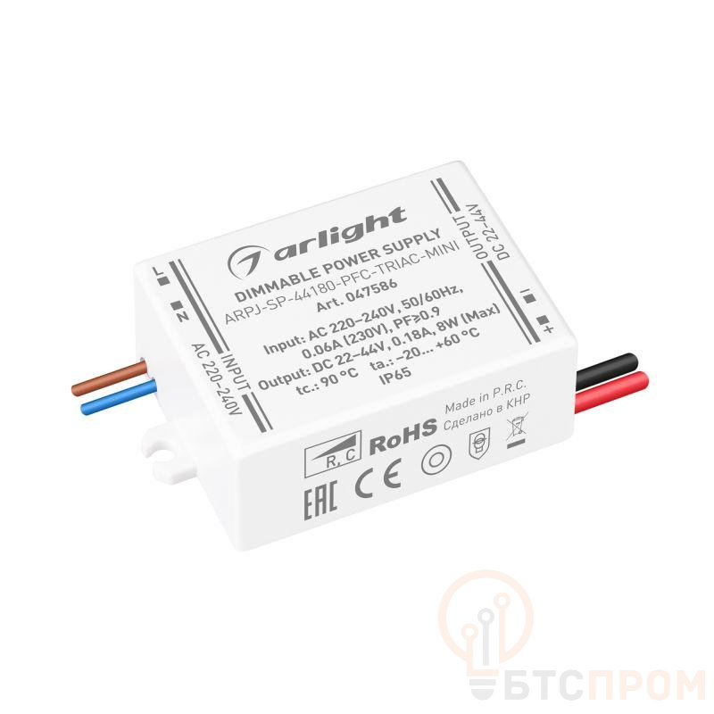 Диммируемый источник тока по стандарту TRIAC с гальванической развязкой для светильников и мощных светодиодов. Входное напряжение 220-240 VAC. Выходные параметры: 22-44 В, 180 mА, 8 Вт. Встроенный PFC >0,9. Герметичный пластиковый корпус IP 65. Габаритные размеры длина 58 мм. (без креплений 48мм) , ширина 36 мм, высота 20 мм. Гарантийный срок 5 лет.