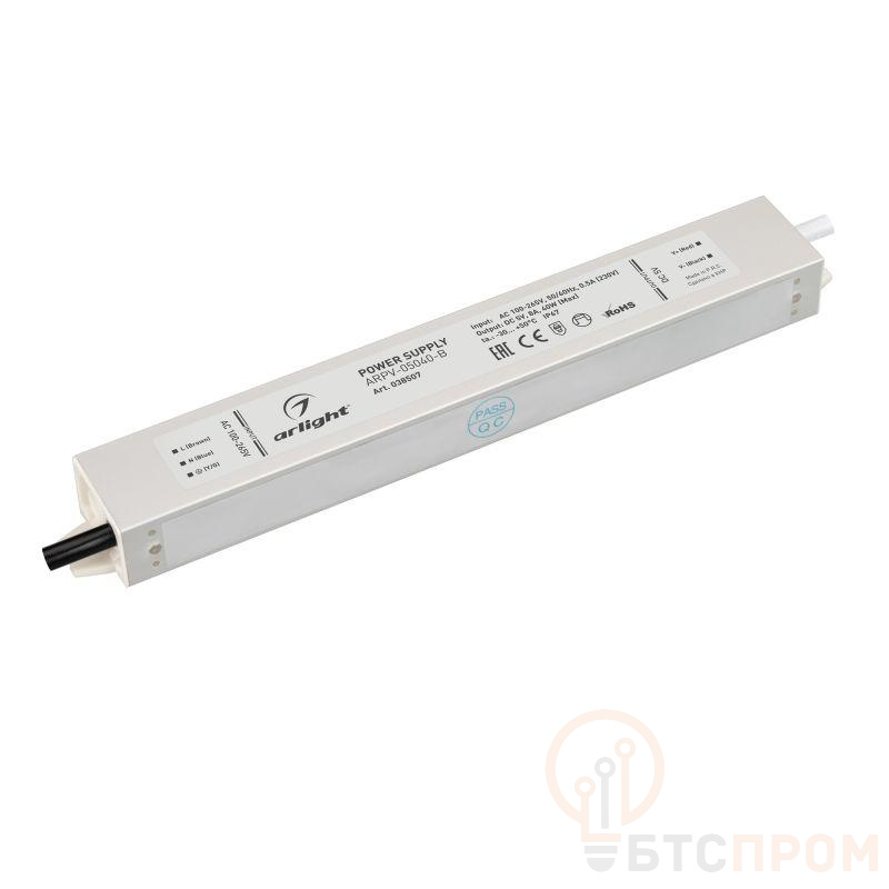 Источник напряжения с гальванической развязкой для светодиодных изделий. Входное напряжение 100-240 VAC. Выходные параметры: 5 В, 8 А, 40 Вт. Герметичный пластиковый корпус IP 67. Рабочая температура -30…+50C?. Габаритные размеры длина 223 мм, ширина 30 мм, высота 20 мм. Гарантийный срок 3 года.
