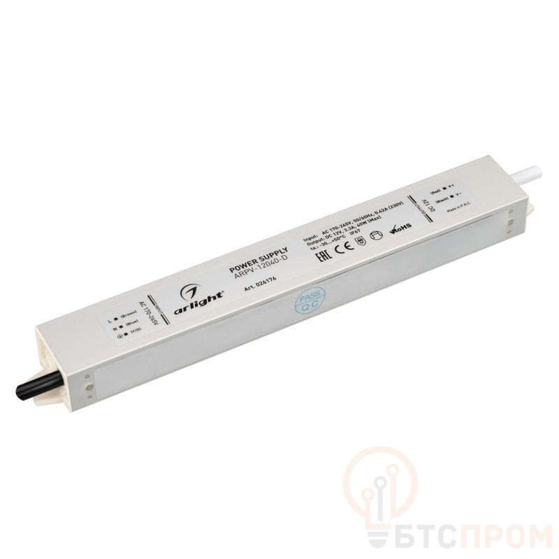 Источник напряжения с гальванической развязкой для светодиодных изделий. Входное напряжение 170-265 VAC. Выходные параметры: 12 В, 3,3 А, 40 Вт. Встроенный PFC >0,5. Герметичный алюминиевый корпус IP 67. Рабочая температура -30…+50C?. Габаритные размеры длина 217 мм, ширина 30 мм, высота 20 мм. Гарантийный срок 3 года.