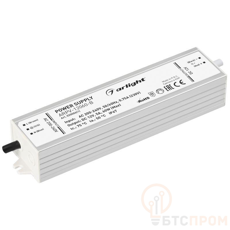 Источник напряжения с гальванической развязкой для светодиодных изделий. Входное напряжение 200-240 VAC. Выходные параметры: 12 В, 5 А, 60 Вт. Встроенный PFC >0,5. Герметичный алюминиевый корпус IP 67. Рабочая температура -25…+50C?. Габаритные размеры длина 179 мм, ширина 41 мм, высота 31 мм. Совместим с диммерами с частотой ШИМ более 5кГц. Гарантийный срок 3 года.