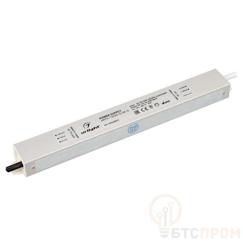 Источник напряжения с гальванической развязкой для светодиодных изделий. Входное напряжение 170-265 VAC. Выходные параметры: 12 В, 5 А, 60 Вт. Встроенный PFC >0,5. Герметичный алюминиевый корпус IP 67. Рабочая температура -30…+50C?. Габаритные размеры длина 257 мм, ширина 30 мм, высота 20 мм. Гарантийный срок 3 года.