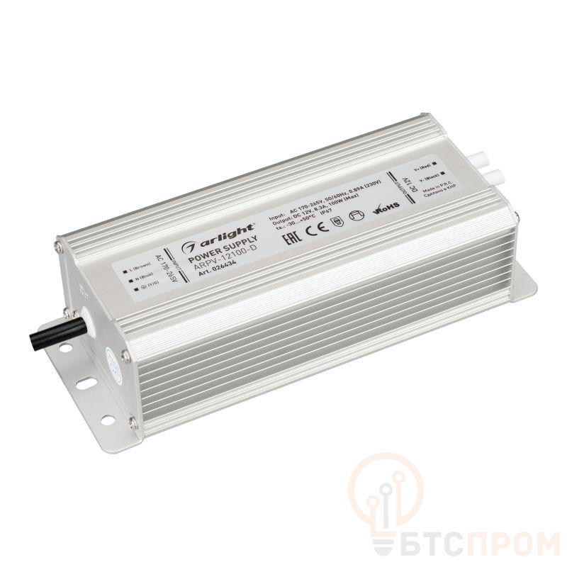 Источник напряжения с гальванической развязкой для светодиодных изделий. Входное напряжение 170-265 VAC. Выходные параметры: 12 В, 8,3 А, 100 Вт. Встроенный PFC >0,5. Герметичный алюминиевый корпус IP 67. Рабочая температура -30…+50C?. Габаритные размеры длина 178 мм, ширина 71 мм, высота 46 мм. Гарантийный срок 3 года.