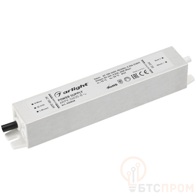 Источник напряжения с гальванической развязкой для светодиодных изделий. Входное напряжение 100-240 VAC. Выходные параметры: 24 В, 0,83 А, 20 Вт. Встроенный PFC >0,5. Герметичный алюминиевый корпус IP 67. Рабочая температура -25…+50C?. Габаритные размеры длина 162 мм, ширина 25 мм, высота 27 мм. Гарантийный срок 3 года.