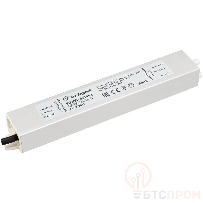 Источник напряжения с гальванической развязкой для светодиодных изделий. Входное напряжение 170-265 VAC. Выходные параметры: 24 В, 1,5 А, 36 Вт. Встроенный PFC >0,5. Герметичный алюминиевый корпус IP 67. Рабочая температура -30…+50C?. Габаритные размеры длина 182 мм, ширина 30 мм, высота 20 мм. Гарантийный срок 3 года.