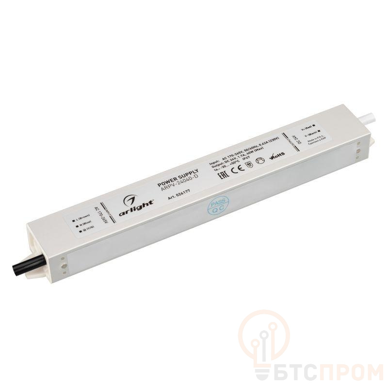 Источник напряжения с гальванической развязкой для светодиодных изделий. Входное напряжение 170-265 VAC. Выходные параметры: 24 В, 1,7 А, 40 Вт. Встроенный PFC >0,5. Герметичный алюминиевый корпус IP 67. Рабочая температура -30…+50C?. Габаритные размеры длина 217 мм, ширина 30 мм, высота 20 мм. Гарантийный срок 3 года.