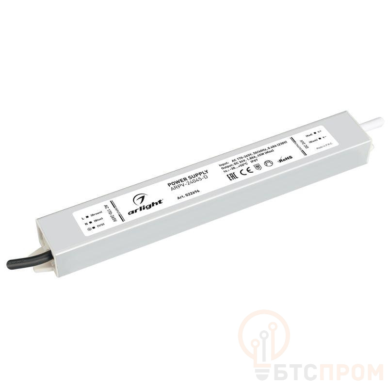 Источник напряжения с гальванической развязкой для светодиодных изделий. Входное напряжение 170-265 VAC. Выходные параметры: 24 В, 1,88 А, 45 Вт. Встроенный PFC >0,5. Герметичный алюминиевый корпус IP 67. Рабочая температура -30…+50C?. Габаритные размеры длина 217 мм, ширина 30 мм, высота 20 мм. Гарантийный срок 3 года.