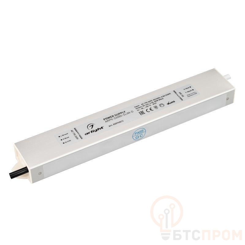 Источник напряжения с гальванической развязкой для светодиодных изделий. Входное напряжение 170-265 VAC. Выходные параметры: 24 В, 3,3 А, 80 Вт. Встроенный PFC >0,5. Герметичный алюминиевый корпус IP 67. Рабочая температура -30…+50C?. Габаритные размеры длина 258 мм, ширина 40 мм, высота 22 мм. Гарантийный срок 3 года.