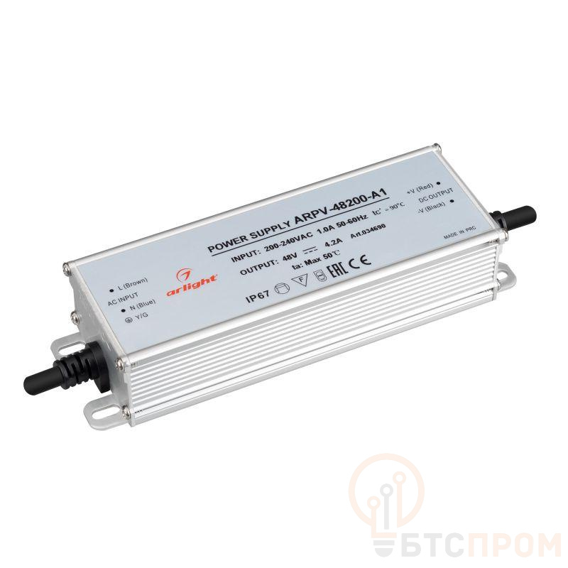 Источник напряжения с гальванической развязкой для светодиодных изделий. Входное напряжение 200-240 VAC. Выходные параметры: 48 В, 4.2 А, 200 Вт. Встроенный PFC >0,5. Герметичный алюминиевый корпус IP 67. Рабочая температура -40…+70C?. Габаритные размеры длина 174 мм, ширина 56 мм, высота 36 мм. Гарантийный срок 3 года.