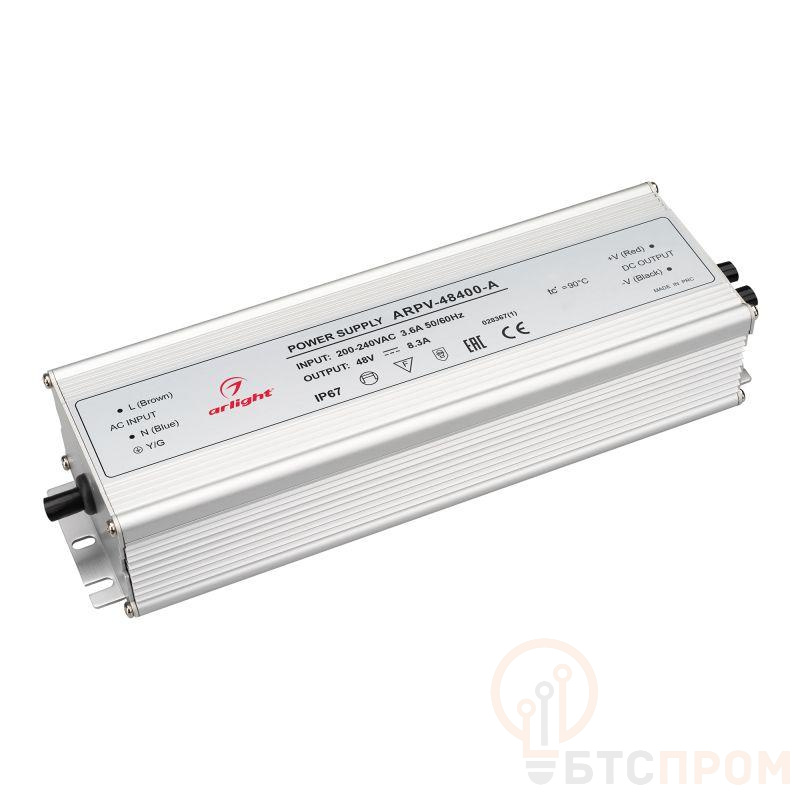 Источник напряжения с гальванической развязкой для светодиодных изделий. Входное напряжение 200-240 VAC. Выходные параметры: 48 В, 8,3 А, 400 Вт. Встроенный PFC >0,5. Герметичный алюминиевый корпус IP 67. Рабочая температура -30…+50C?. Габаритные размеры длина 238 мм, ширина 74 мм, высота 46 мм. Гарантийный срок 3 года. Не допускается использовать источник питания совместно с диммерами (регуляторами освещения), как по входу, так и по выходу источника питания!