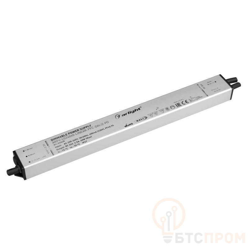 Диммируемый блок питания 24V с гальванической развязкой, ток 2.5А, 60Вт, с управлением DALI, c функцией PUSH-DIM, с корректором мощности, PF>0,95. Тонкий металлический корпус IP67. Вход: 220-240VAC. Выход: 24VDC, ШИМ 1кГц. Размер 290х30х21 mm.. Совместимость со стандартом EMC. Гарантия 5 лет. Допускается использование только внутри помещений.