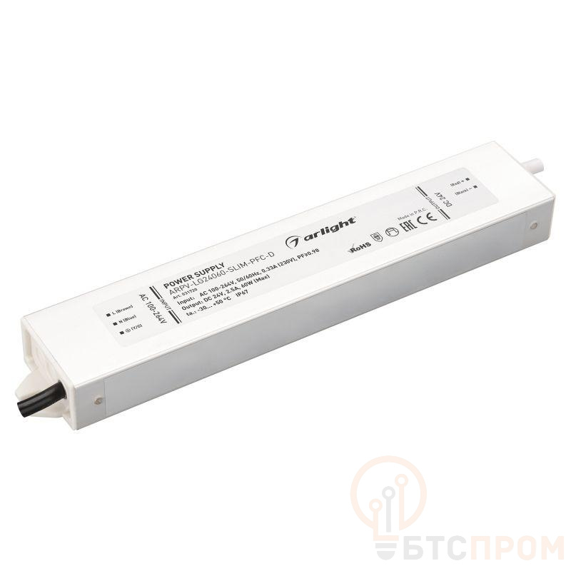 Источник напряжения с гальванической развязкой для светодиодных изделий. Входное напряжение 200-240 VAC. Выходные параметры: 24 В, 2.5 А, 60 Вт. Встроенный PFC >0.98. Герметичный алюминиевый корпус IP 67. Рабочая температура -30…+50C?. Габаритные размеры длина 213 мм, ширина 40 мм, высота 22 мм. Гарантийный срок 5 лет.