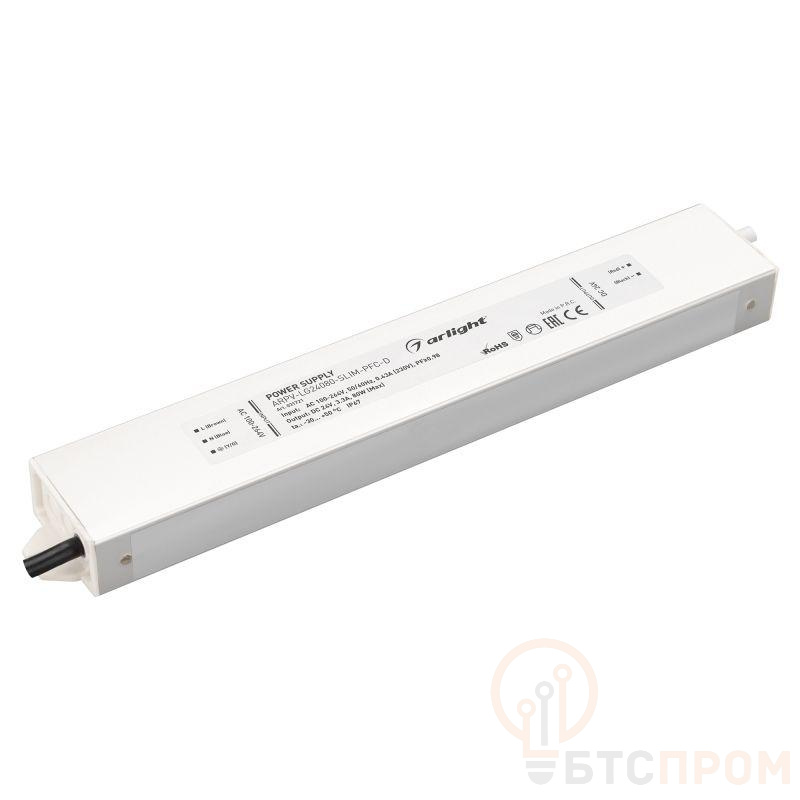Источник напряжения с гальванической развязкой для светодиодных изделий. Входное напряжение 200-240 VAC. Выходные параметры: 24 В, 3.3 А, 80 Вт. Встроенный PFC >0.98. Герметичный алюминиевый корпус IP 67. Рабочая температура -30…+50C?. Габаритные размеры длина 258 мм, ширина 40 мм, высота 22 мм. Гарантийный срок 5 лет.