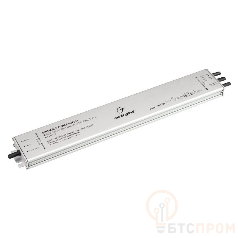 Диммируемый блок питания 24V с гальванической развязкой, ток 16.7А, 400Вт, с управлением DALI, c функцией PUSH-DIM, с корректором мощности, PF>0,95. Тонкий металлический корпус IP67. Вход: 220-240VAC. Выход: 24VDC, ШИМ 1кГц. Размер 400х60х22 mm.. Совместимость со стандартом EMC. Гарантия 5 лет. Допускается использование только внутри помещений.