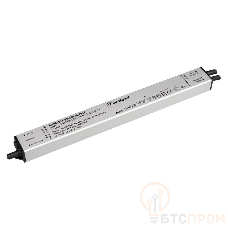 Диммируемый блок питания 48V с гальванической развязкой, ток 1.25А, 60Вт, с управлением DALI, c функцией PUSH-DIM, с корректором мощности, PF>0,95. Тонкий металлический корпус IP67. Вход: 220-240VAC. Выход: 48VDC, ШИМ 1кГц. Размер 290х30х21 mm.. Соответствует требованиям EMC. Гарантия 5 лет. Допускается использование только внутри помещений.