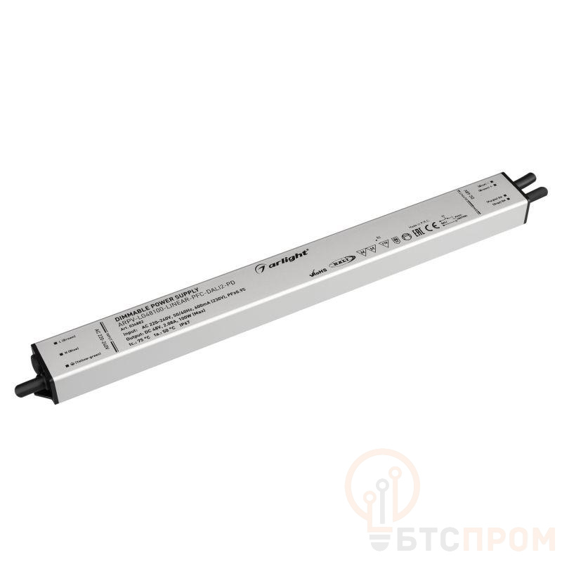 Диммируемый блок питания 48V с гальванической развязкой, ток 2.08А, 100Вт, с управлением DALI, c функцией PUSH-DIM, с корректором мощности, PF>0,95. Тонкий металлический корпус IP67. Вход: 220-240VAC. Выход: 48VDC, ШИМ 1кГц. Размер 320х30х21 mm.. Соответствует требованиям EMC. Гарантия 5 лет. Допускается использование только внутри помещений.