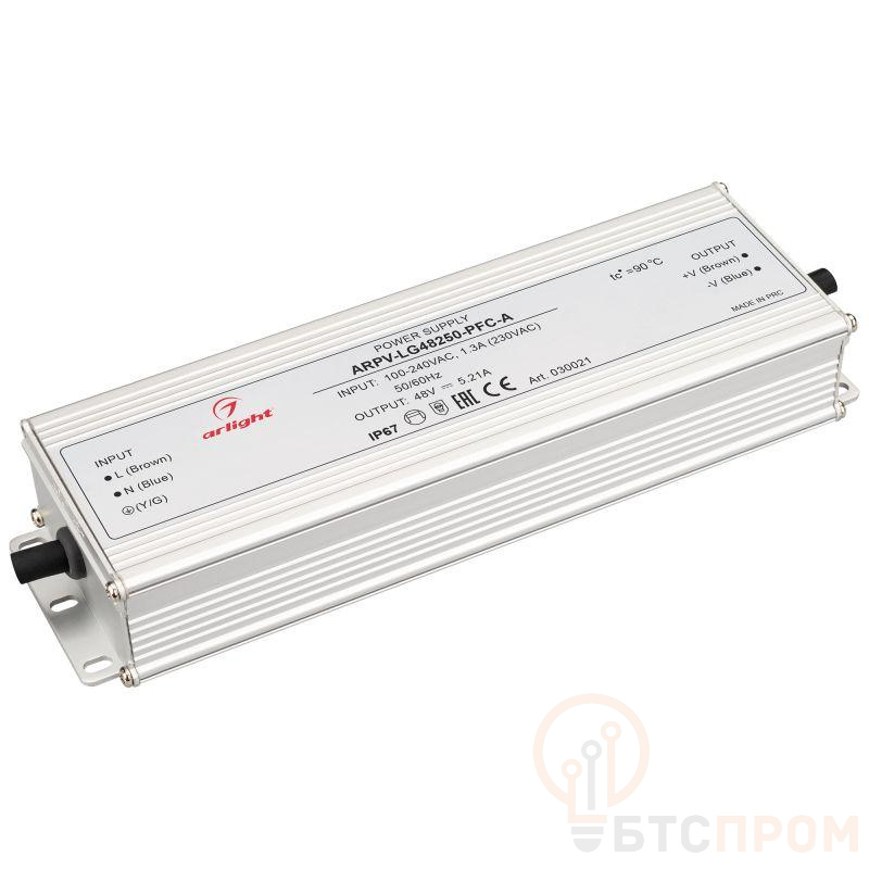 Источник напряжения с гальванической развязкой для светодиодных изделий. Входное напряжение 100-240 VAC. Выходные параметры: 48 В, 5.21 А, 250 Вт. Встроенный PFC >0.9. Герметичный алюминиевый корпус IP 67. Рабочая температура -40…+70C?. Габаритные размеры длина 219 мм, ширина 67.5 мм, высота 35.5 мм. Гарантийный срок 5 лет.