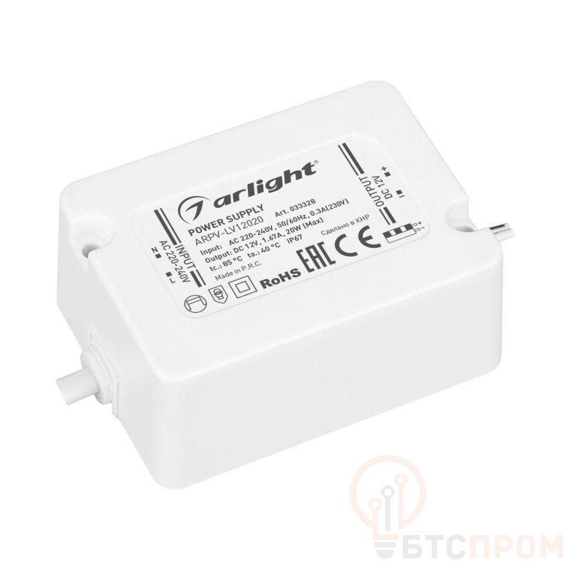 Источник напряжения с гальванической развязкой для светодиодных изделий. Входное напряжение 200-240 VAC. Выходные параметры: 12 В, 1.67 А, 20 Вт. Встроенный PFC >0.5. Герметичный пластиковый корпус IP 67. Рабочая температура -10…+40C?. Габаритные размеры длина 65 мм, ширина 48 мм, высота 28 мм. Гарантийный срок 3 года.
