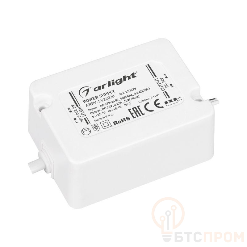 Источник напряжения с гальванической развязкой для светодиодных изделий. Входное напряжение 200-240 VAC. Выходные параметры: 24 В, 0.83 А, 20 Вт. Встроенный PFC >0.5. Герметичный пластиковый корпус IP 67. Рабочая температура -10…+40C?. Габаритные размеры длина 65 мм, ширина 48 мм, высота 28 мм. Гарантийный срок 3 года.